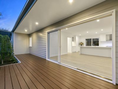 Situated in the highly sought ‘Old Dromana’ this exquisite brand new, elegant Hamptons style residence stands a little over 300m stroll from pristine sandy shores. Constructed with an absolute eye for detail, this timeless three bedroom weatherboard home delivers every essential, in stunning style. Open plan living adjoins a central, feature filled designer kitchen complete with every modern convenience, as alfresco entertaining amidst superb landscaped gardens allows effortless entertaining or simply spacious everyday living. Retire of an evening to the master bedroom complemented by his and hers walk through robe, full ensuite with in floor heating, plus double doors leading to a private deck and courtyard to enjoy a little northerly sun amongst pretty tree top surrounds. Both the additional double robed bedrooms share in the family bathroom with relaxing full bath tub, powder room and well fitted full laundry. An impressive list of fittings, fixtures and subtle touches add the ultimate finish as ducted heating and cooling is sure to ensure total year round comfort. Access to a double remote garage, exposed aggregate driveway, full fencing and landscaping provide a total ‘turnkey’ option for you to simply move on in and enjoy this amazing beach side location. You’ll have everything the Peninsula has to offer right at your fingertips and the quality of home that is seldom found in such a popular locale.