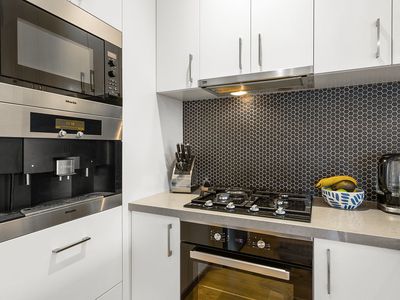 The living space is enhanced by timber flooring showcasing the kitchen flush with mod cons including good storage, stainless appliances, gas cook top, dishwasher and built in Miele coffee machine and microwave just for good measure.